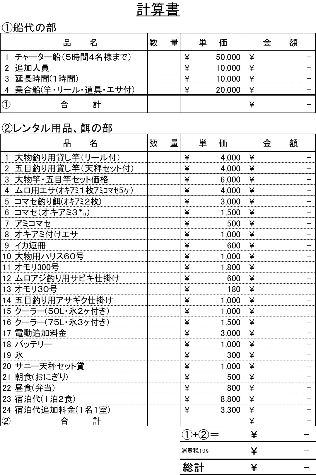 仕立て船 ![]() 貸し竿:大物からコマセ用まで全部揃ってます! 手ぶらで来ても大丈夫! 4名様5時間まで 55,000円 一人増える毎に 11,000円 |